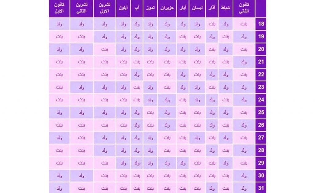 الجدول الصيني لمعرفة نوع الجنين بالميلادي بنات one